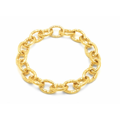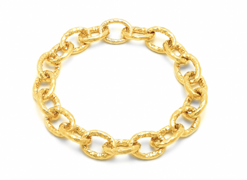 La collana Stone Dorata regala al volto una luminosità unica. Realizzata in lastra d'argento martellata a mano e successivamente piegata a mano e bagnata nell'oro. Creata a mano in Italia, si presenta con chiusura a scomparsa.