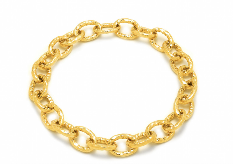 La collana lunga Stone Dorata regala al volto una luminosità unica. Realizzata in lastra d'argento martellata a mano e successivamente piegata a mano e bagnata nell'oro. Creata a mano in Italia, si presenta con chiusura a scomparsa.