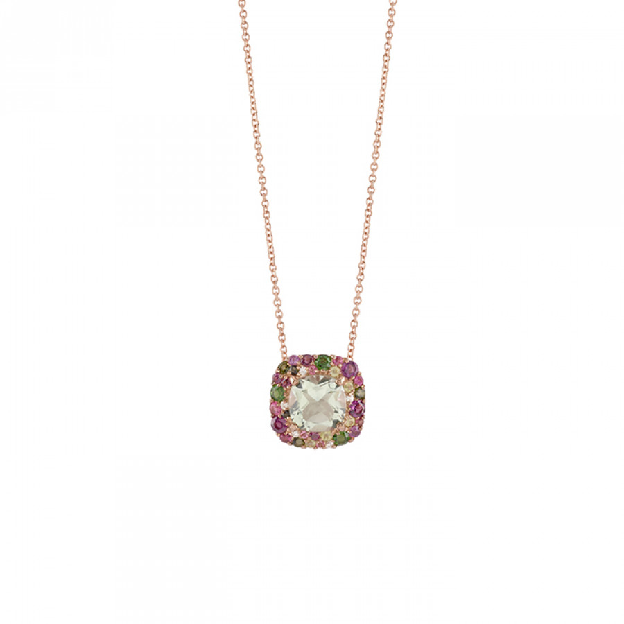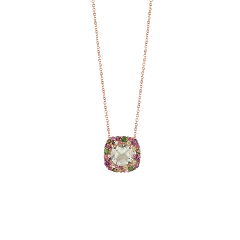 Collana Salvini Gioielli con prasiolite taglio cuscino con contorno di diamanti, rodolite rosa, tormalina rosa e verde, peridoti, della collezione BonBon.
