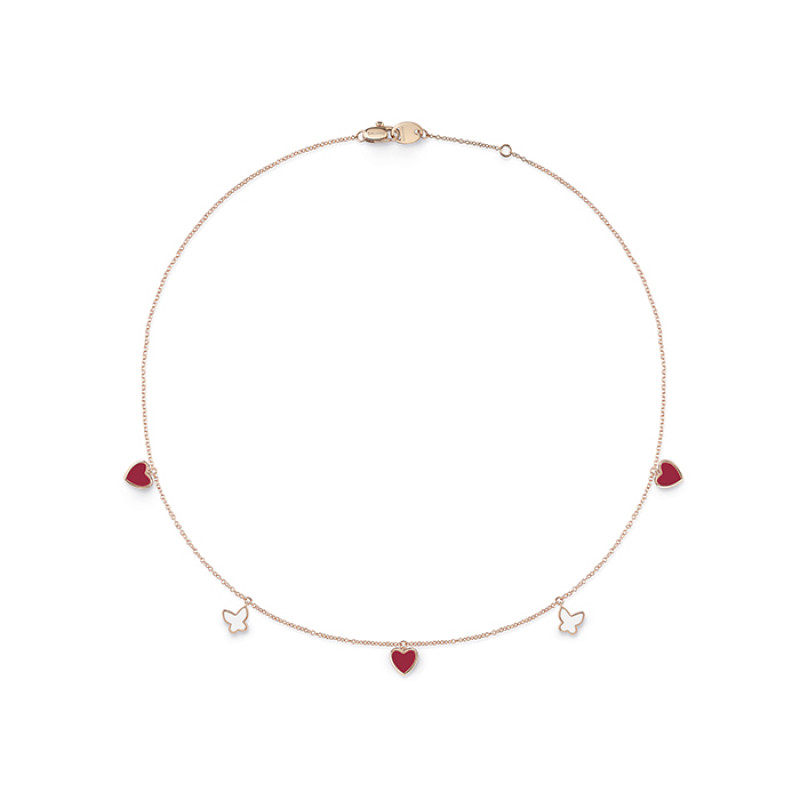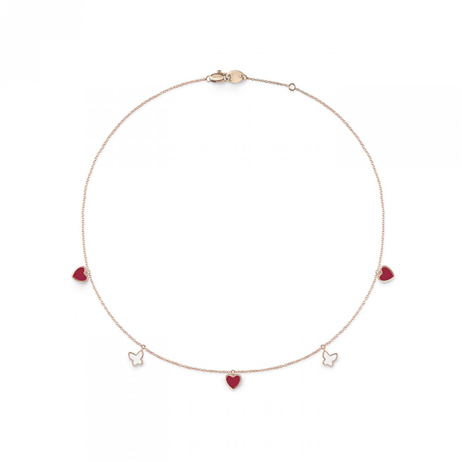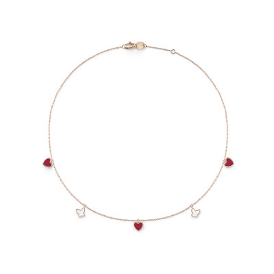 Collana in oro rosa e hybrid ceramica rossa e bianca con Cuore e Farfalla