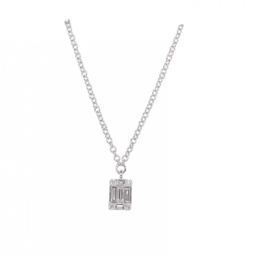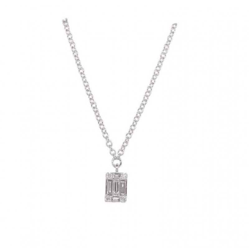 Collana in oro bianco e diamanti taglio rotondo/baguette 0,1 ct. Gh e diamante centrale 0.09 ct.
