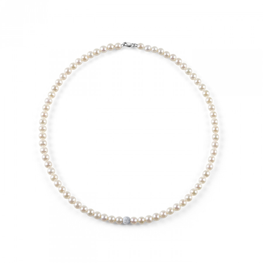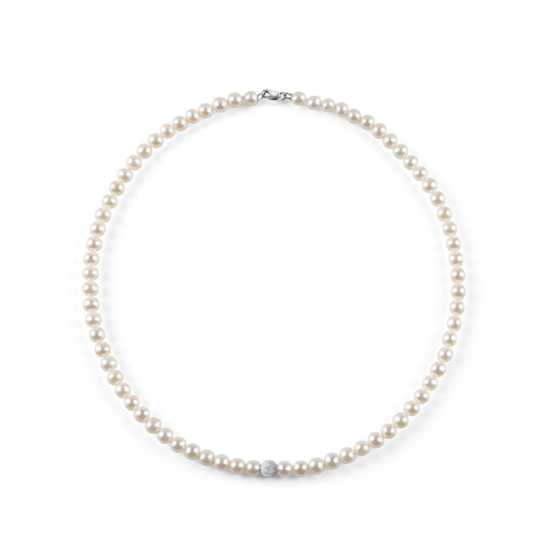 Collana di perle in oro bianco, perle 5,5/6 mm con 3 sfere obcm 42 e diamanti