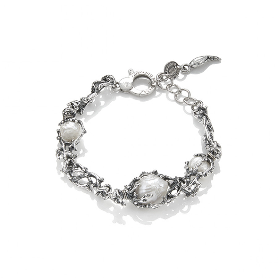 Collezione Mari del Sud - L'argento fluisce in forme coralline e si sposa con le perle naturali d'acqua dolce dai riflessi bianco opalescenti.