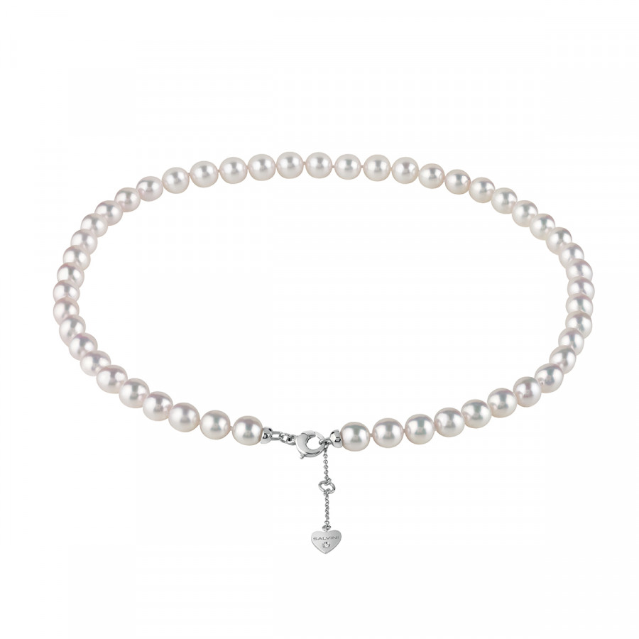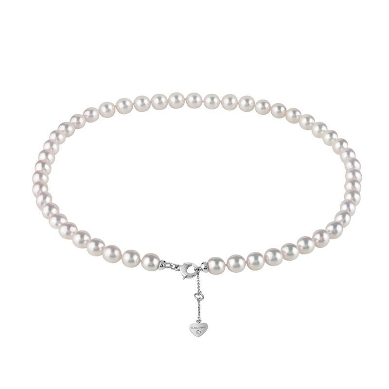 Collana di perle giapponesi bianche con chiusura in oro bianco e diamante, della collezione Le Perle Salvini di Salvini.