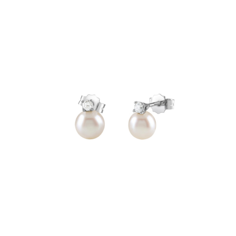 Orecchini Bliss Paradise in oro bianco 18 KT, diamanti 0.1 CT e perle bianche 6 mm