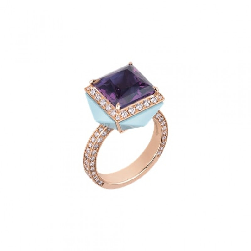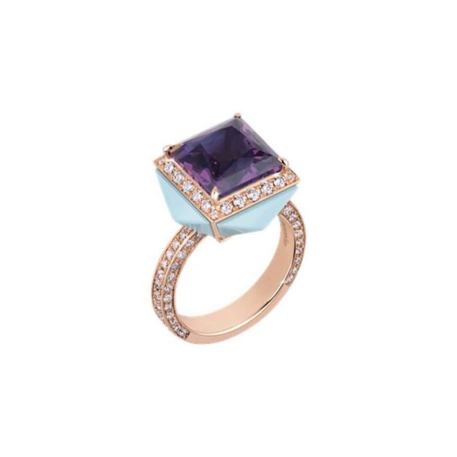 Anello Chantecler Piazzetta in oro rosa 18Kt con centro in ametista e cuspidi in diamanti e turchese
