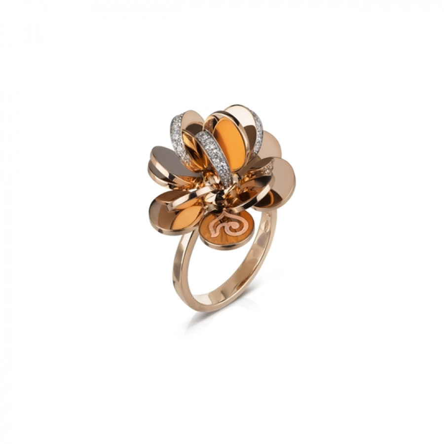 Qui troviamo l'anello fiore appartenente alla collezione Chantecler Paillettes in oro rosa 18kt e diamanti. Formato grande.