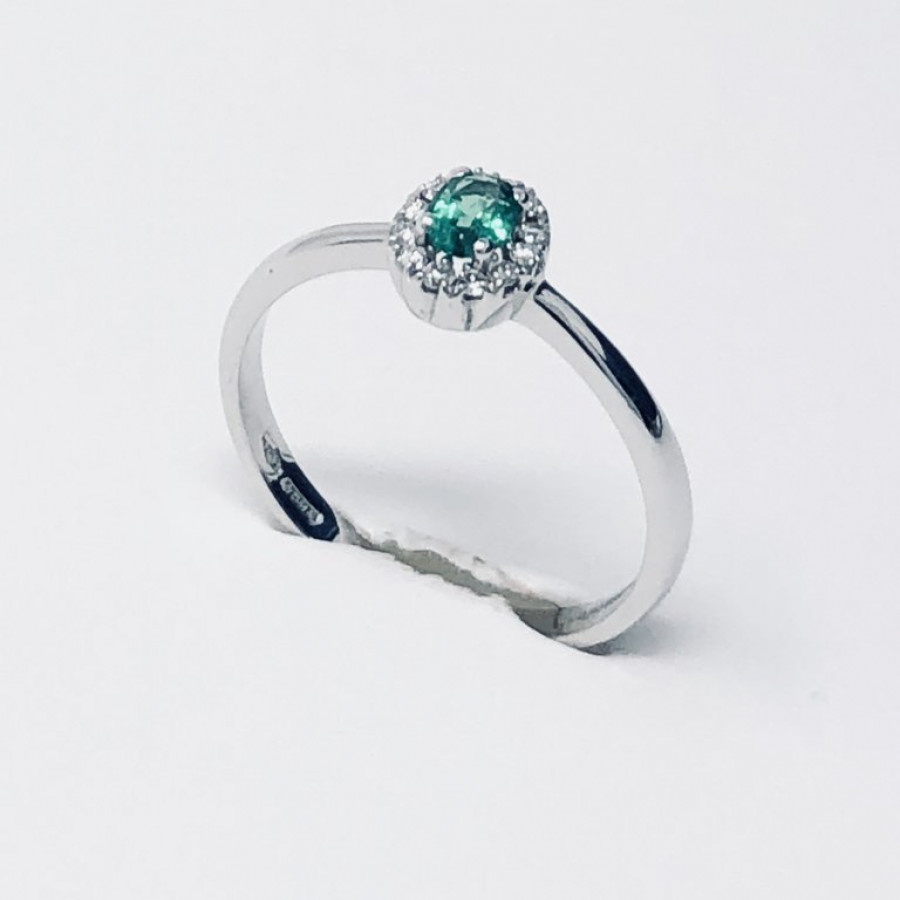 Questo anello in oro 750 gr.2.20 è caratterizzato da diamanti a taglio brillante ct.0.08 colore G purezza VS e uno smeraldo di ottima qualità ct.0.18