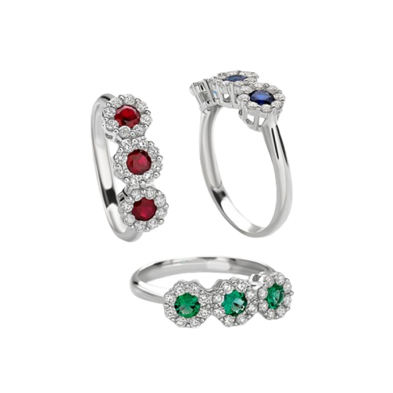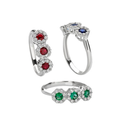 Anello trilogy in oro bianco con pietre di colore zaffiri centrali e contorno di diamanti 0,41 ct. GH taglio brillante.