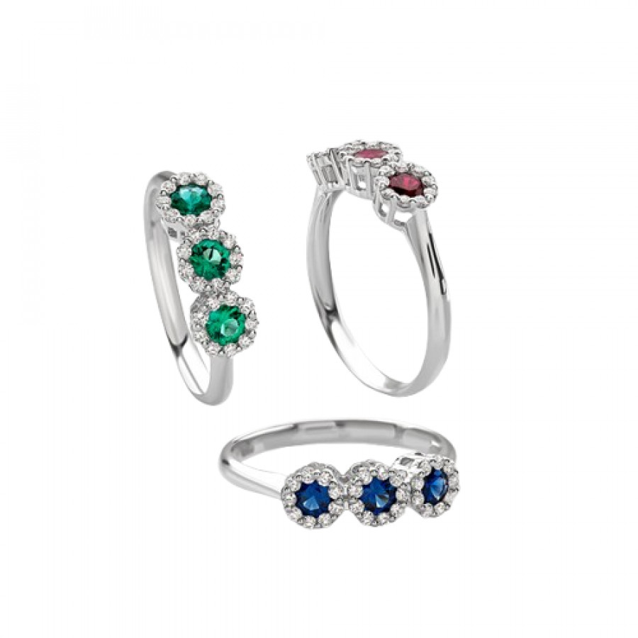 Anello trilogy in oro bianco con pietre di colore zaffiri centrali e contorno di diamanti taglio brillante.