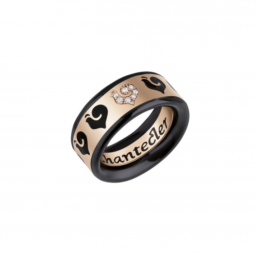 Anello fascia Carousèl in oro rosa 18Kt, galli in pavè di diamanti e smalto nero di Chantecler della collezione Paillettes.