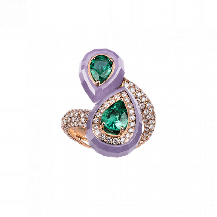 Anello Chantecler Joyful in oro rosa 18 kt, diamanti, smeraldi e giada lavanda.
