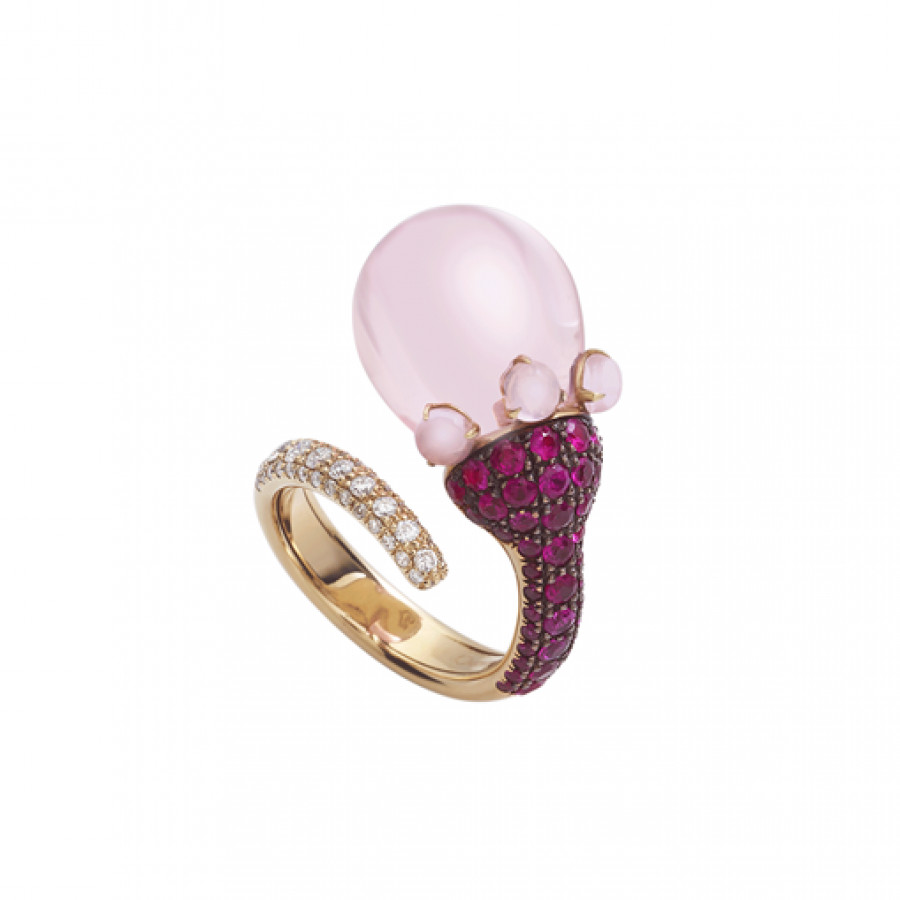 Anello in oro rosa 18Kt, diamanti, zaffiri rosa e poire in cristallo color rosa di Chantecler della collezione Joyful.