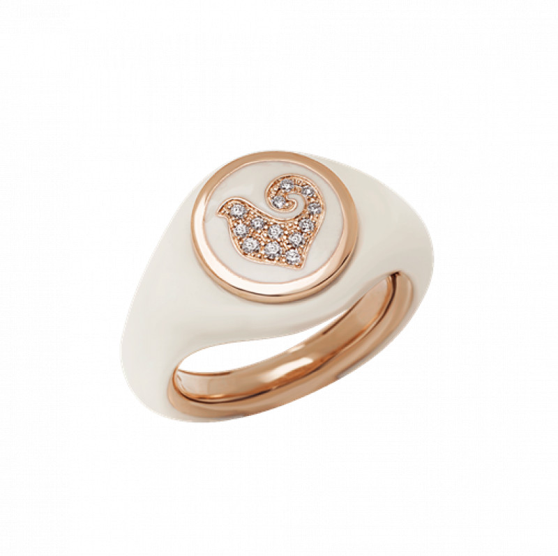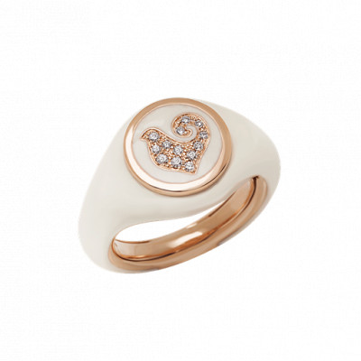 Anello Paillettes Sygillum in oro rosa 18Kt, galletto in pavè di diamanti e smalto bianco