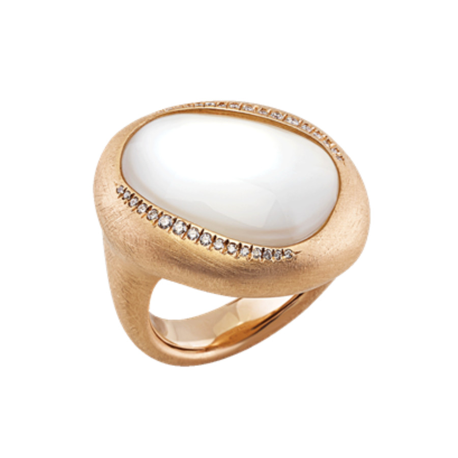 Anello in oro giallo satinato 18Kt, diamanti, madreperla e cristallo di rocca.