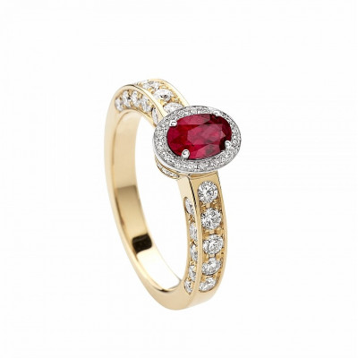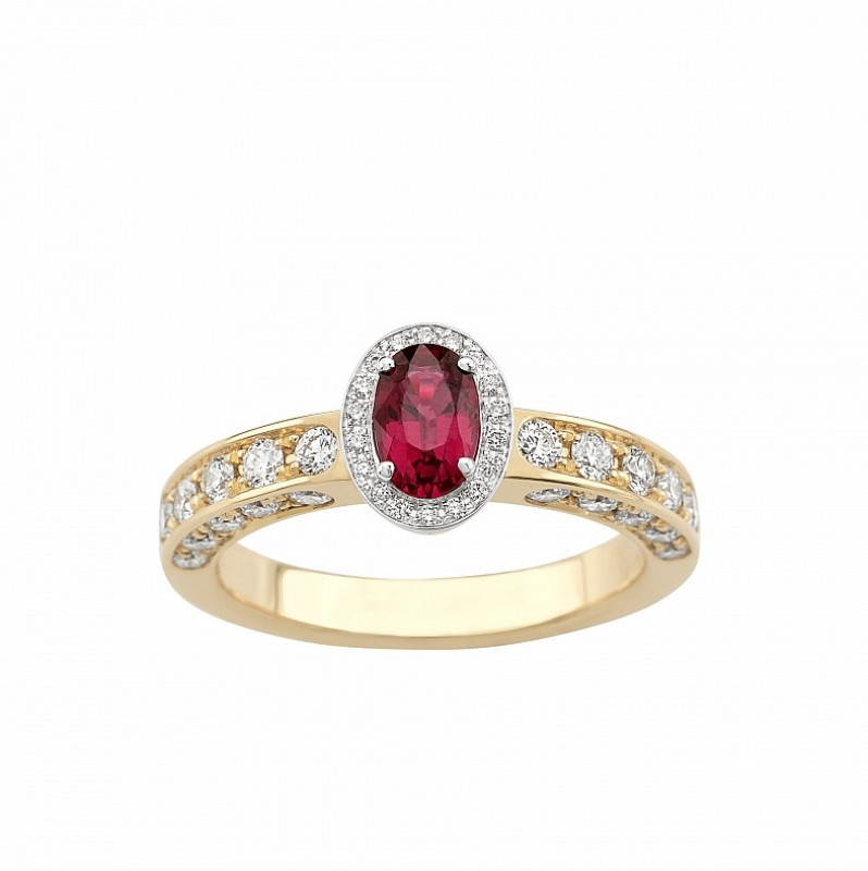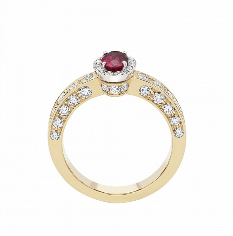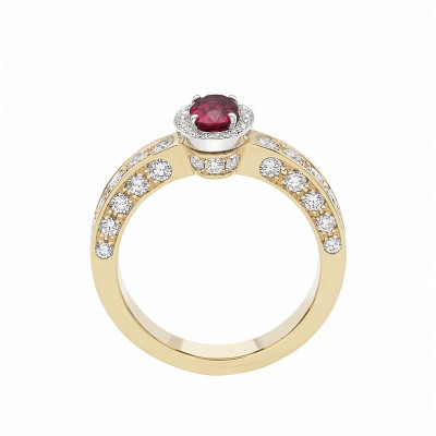 Giorgio Visconti anello solitario in oro bianco, rosa e rubino centrale taglio ovale con contorno e gambo di brillanti incassati a pavé.