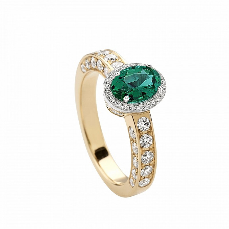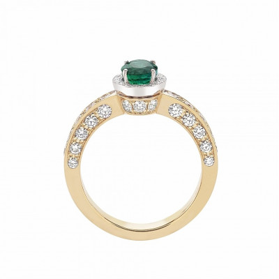 Giorgio Visconti anello solitario in oro bianco, rosa e smeraldo centrale taglio ovale con contorno e gambo di brillanti incassati a pavé.