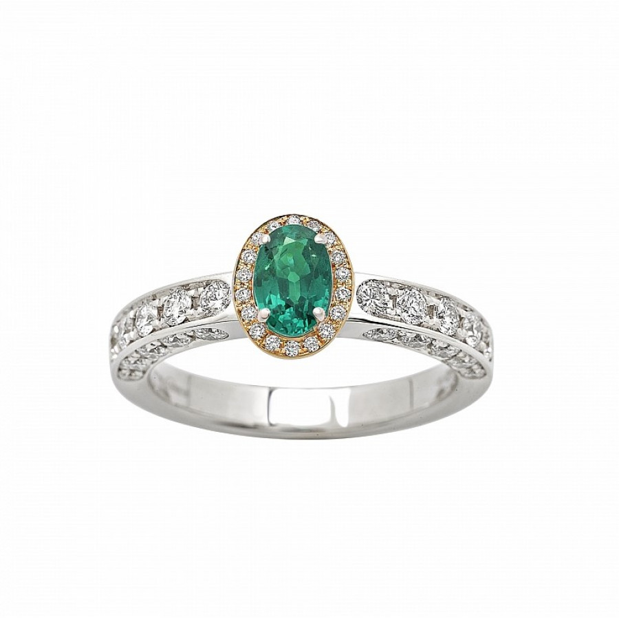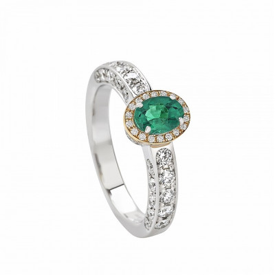 Giorgio Visconti anello solitario in oro bianco, rosa e smeraldo centrale taglio ovale con contorno e gambo di brillanti incassati a pavé.