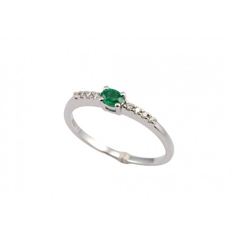 Anello solitario in oro bianco con pietra smeraldo centrale ct. 0,15 e contorno di diamanti taglio brillante ct. 0,07 G VS