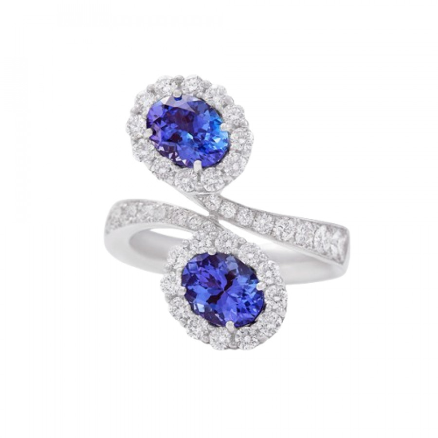 Anello in oro bianco con diamanti 1,34 ct. G VS taglio brillante e due tanzaniti taglio ovale.