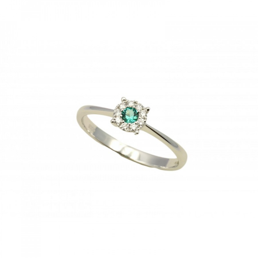 Anello solitario in oro bianco con pietra smeraldo centrale ct. 0,07 e contorno di diamanti taglio brillante ct. 0,08 G VS