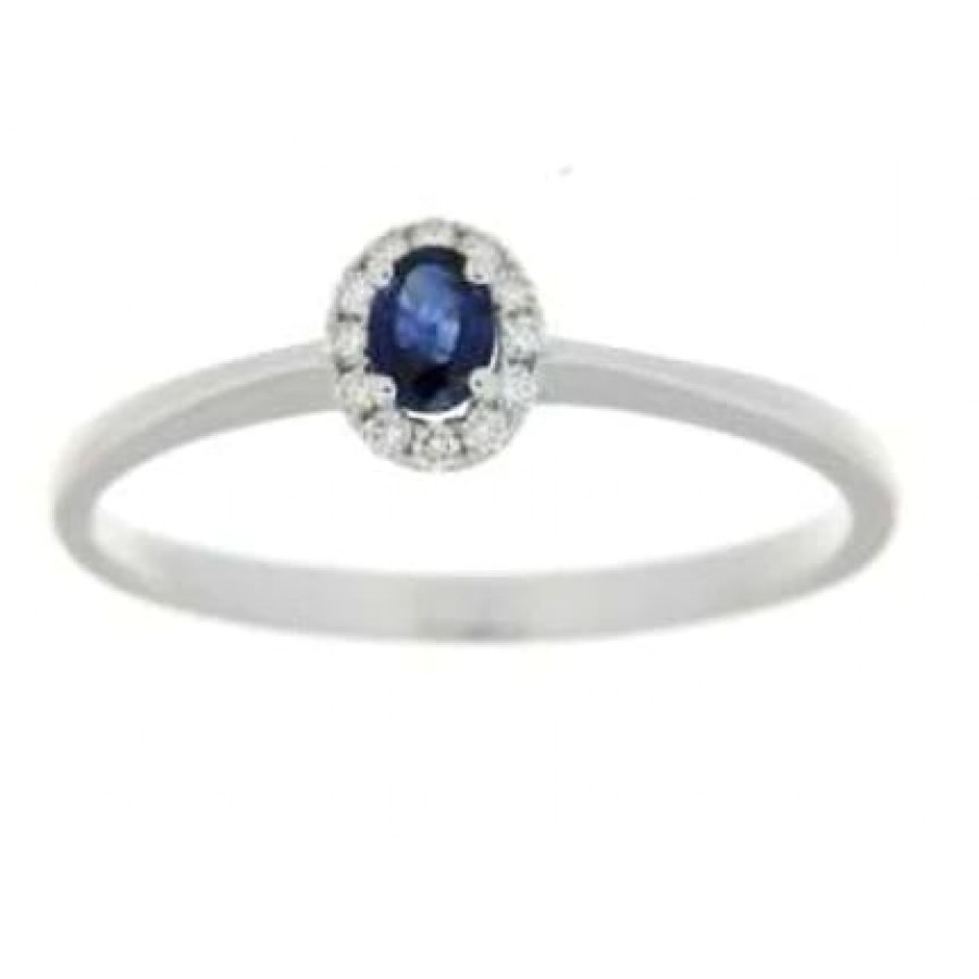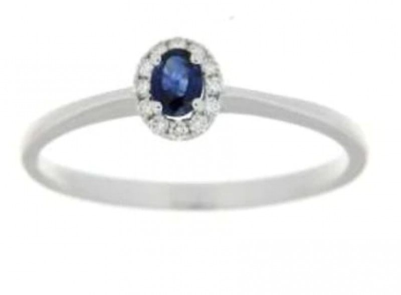 Anello solitario in oro bianco con pietra zaffiro centrale ct. 0,24 e contorno di diamanti taglio brillante ct. 0,07 G VS