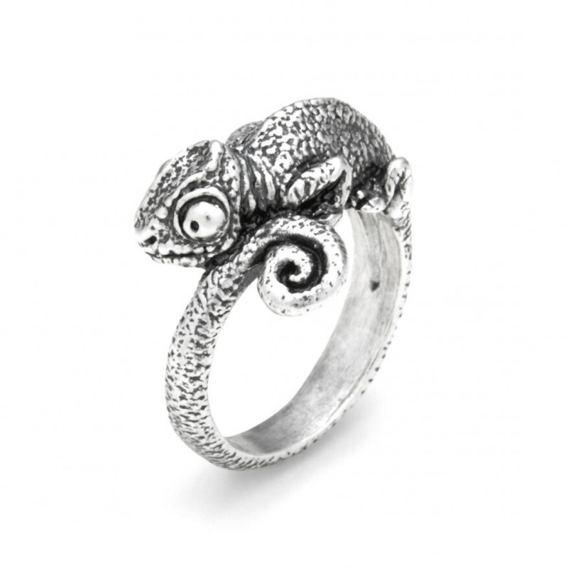 Questo sorprendente anello in argento brunito regala tutto il fascino degli animali esotici. Un camaleonte, simbolo di vivacità e di mistero, con la sua coda, si avvolge con eleganza al dito. Il gioiello è stato realizzato completamente in azienda, utilizzando l'antica tecnica della fusione a cera persa.