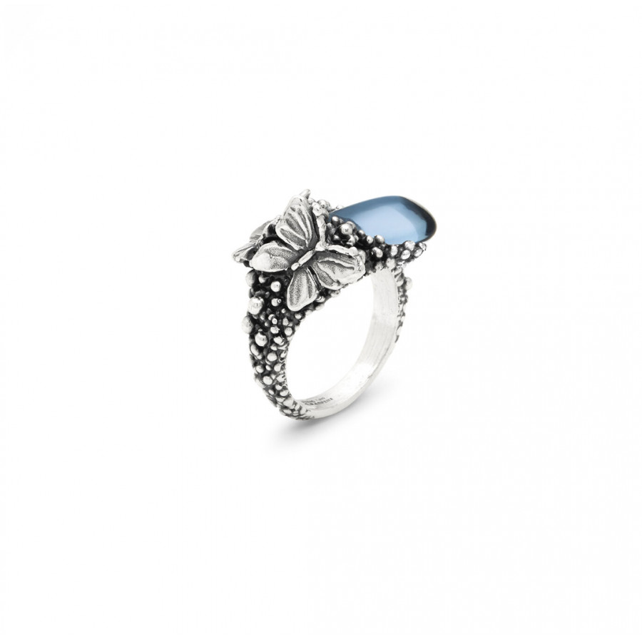 Un'eleganza eterea prende forma nell'anello Goccia Farfalle, dove leggere farfalle in argento, realizzate con la tecnica della fusione a cera persa, si posano delicatamente attorno a un cristallo nel suggestivo colore blu ciano.