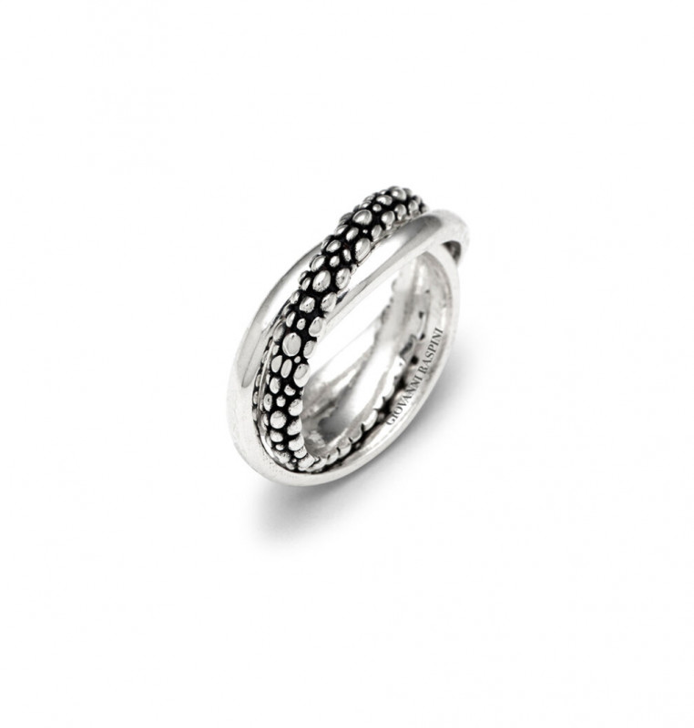 Due anelli "a fedina" luminosissimi ne incontrano un altro col decoro Perlage, creando nuove prospettive di bellezza. Questo anello triplo in argento e argento brunito regala tutto il fascino dell'antica fusione a cera persa, coniugando minimalismo e artigianalità realizzativa. Fatto completamente a mano in azienda.