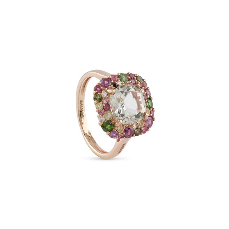Anello Salvini Gioielli con prasiolite taglio cuscino con contorno di diamanti, rodolite rosa, tormalina rosa e verde, peridoti, della collezione BonBon