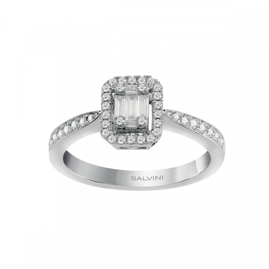 Anello solitario in oro bianco con diamanti, della collezione Magia di Salvini.