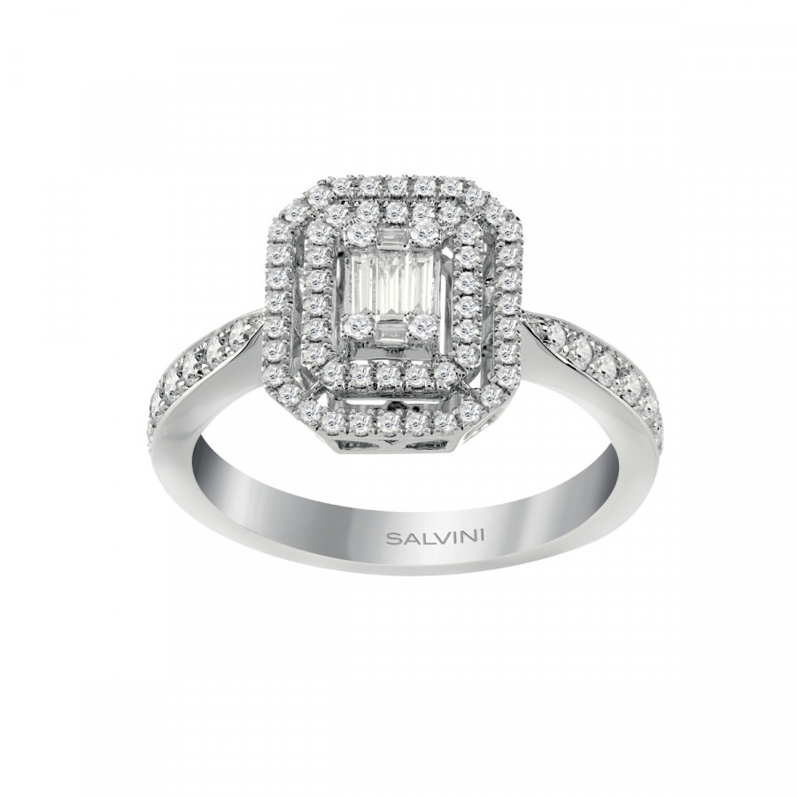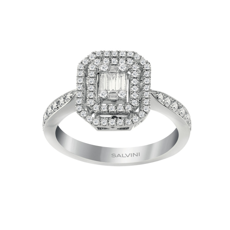 Anello solitario in oro bianco con diamanti, della collezione Magia di Salvini.