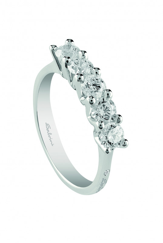 Anello in oro bianco e 5 diamanti, della collezione Virginia di Salvini.