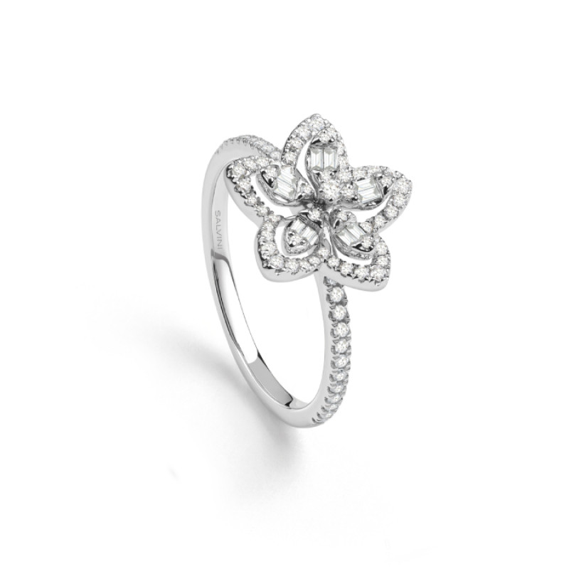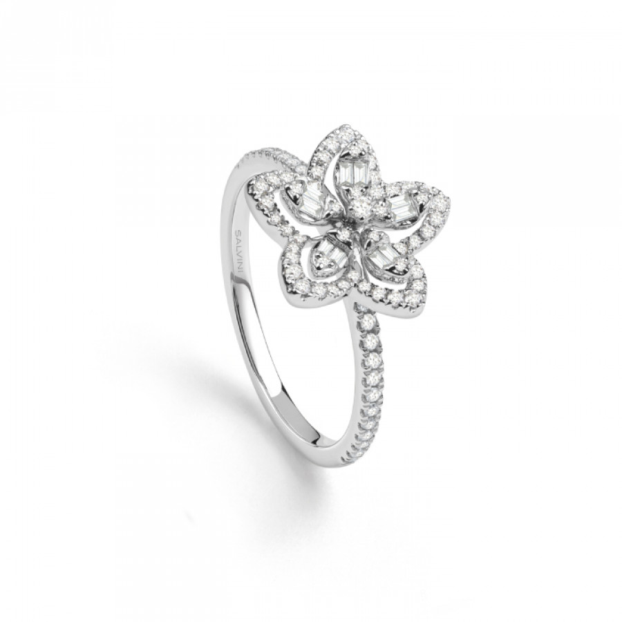 Anello Salvini Magia Garden piccolo in oro bianco con diamanti taglio baguette e rotondo, gambo incastonato di diamanti