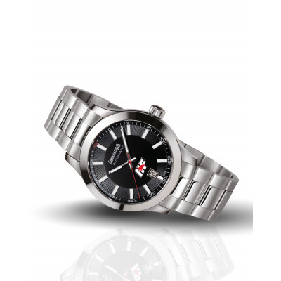 Orologio meccanico a carica automatica. Cassa 41mm in acciaio con finiture lucide e satinate, vetro zaffiro con trattamento antiriflesso, lunetta in acciaio lucido, con fibbia acciaio personalizzata “E&C”. Impermeabilità 50 m, distanza tra le anse 20 mm. Il cinturino ha due versioni: bracciale Chablis in acciaio con chiusura 2CLICK® oppure cinturino in pelle vintage con passante ed impunture rosse.