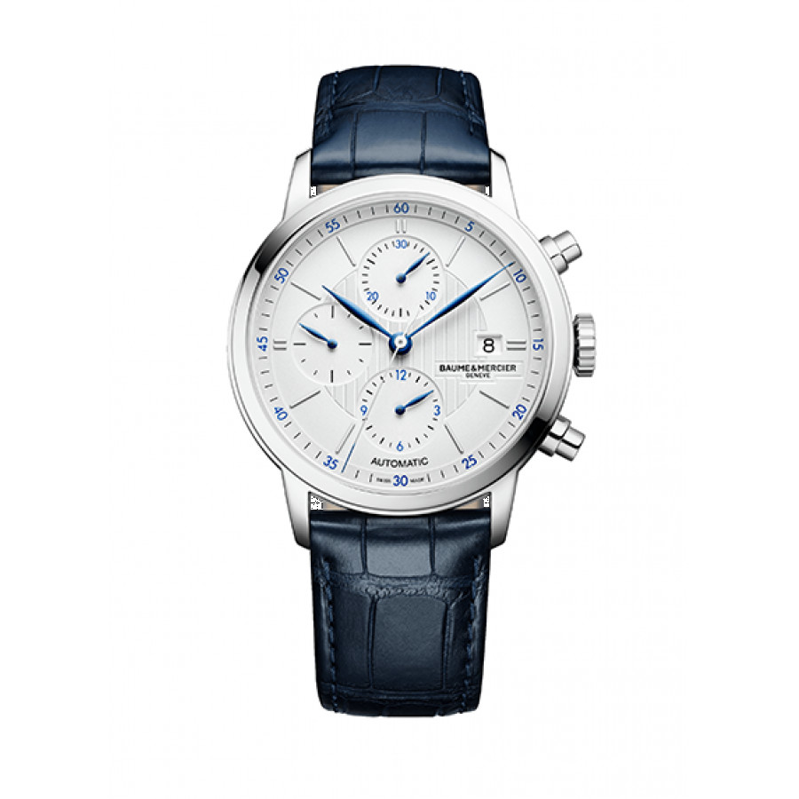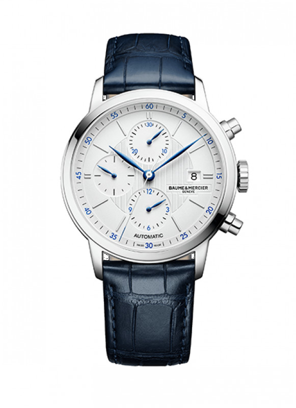 Cronografo automatico con cinturino in pelle della collezione Classima di Baume & Mercier.