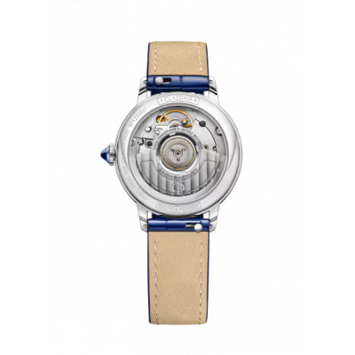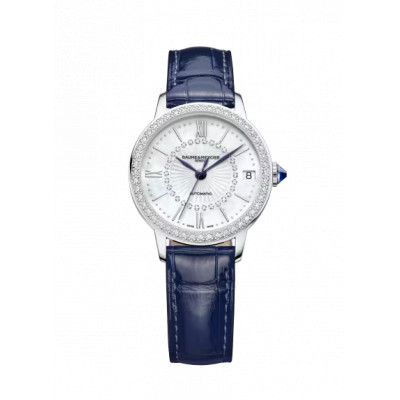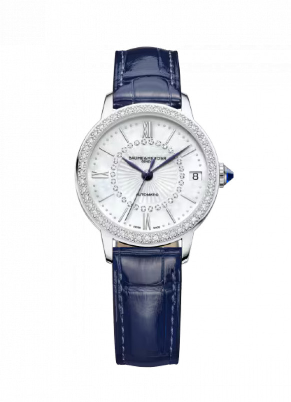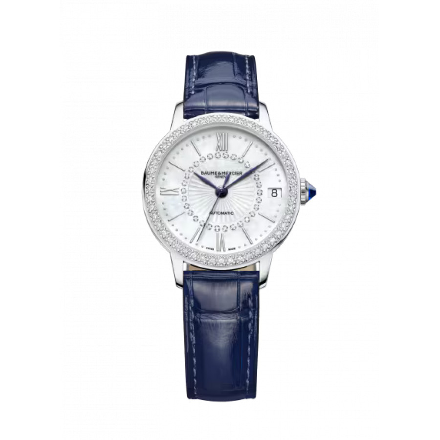 Questo orologio da donna da 31 mm, di forma rotonda e dal design raffinato, declinato in acciaio, è impreziosito da un quadrante in madreperla con diamanti. La cassa in acciaio inossidabile con finitura lucida e diamanti e le lancette a foglia di colore blu offrono uno stile ricercato. Il Classima 10808 è accompagnato da un cinturino in pelle di alligatore blu e animato da un movimento automatico.