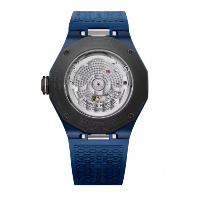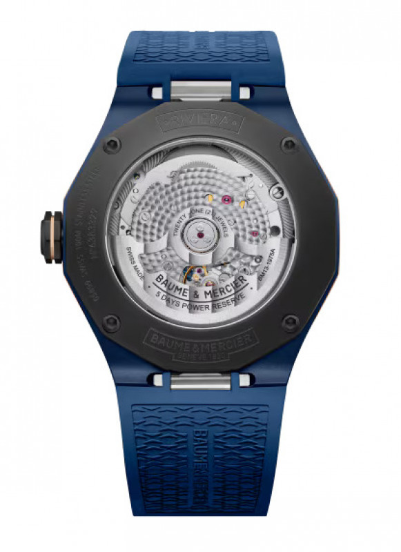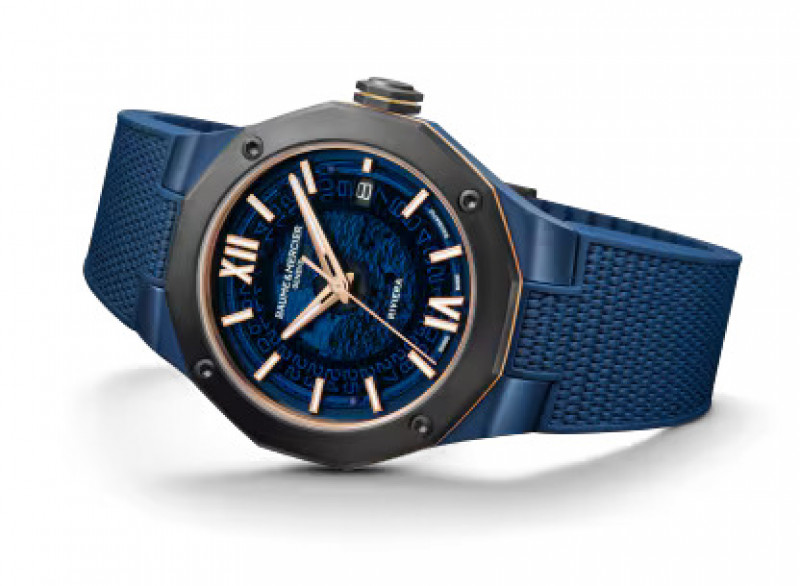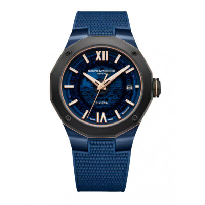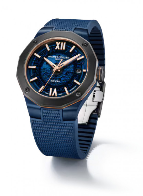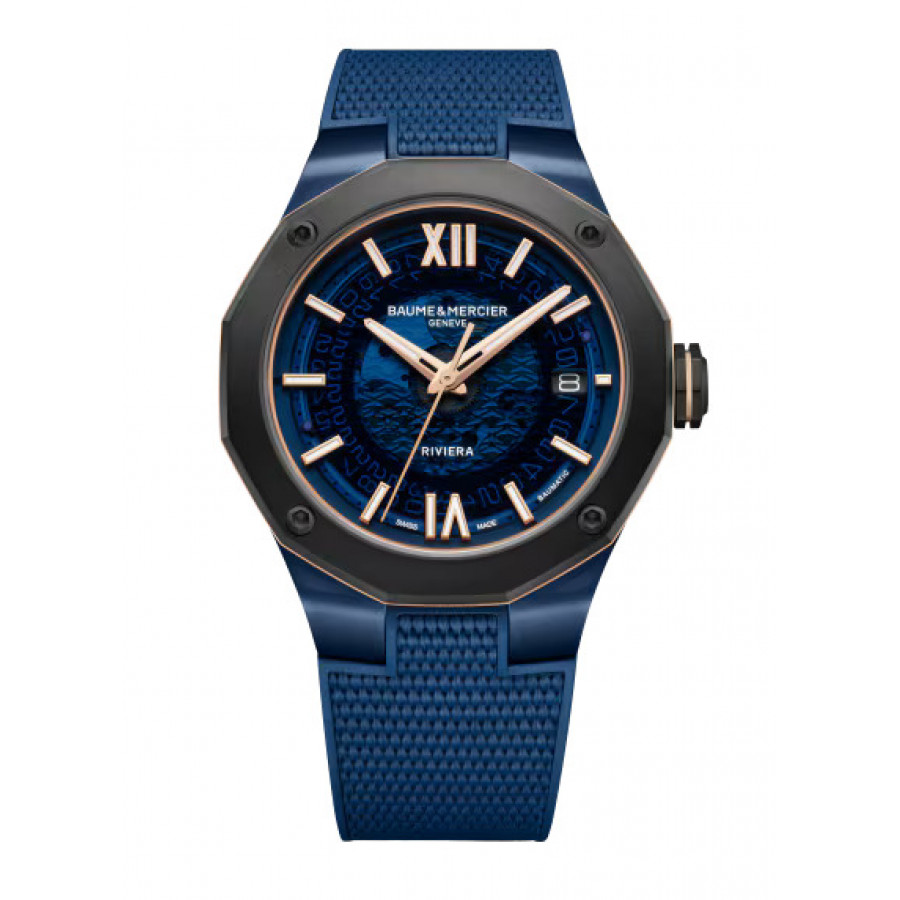 Il look sportivo del Riviera 10769 mutua dalla pietra le delicate tonalità sfumate, alle quali si contrappone il quadrante blu che richiama le profondità del mare. Questa declinazione del Riviera è racchiusa in una cassa dodecagonale di 42 mm di diametro. La raffinata maestria artigianale ne intensifica la luce, valorizzando i contrasti grafici di colori e indicazioni temporali. In questa versione bicolore, che abbina sobriamente il titanio e il PVD blu, il Riviera si impone in tutta la sua forza. Animato da un movimento Baumatic di Manifattura, il segnatempo garantisce precisione, durabilità e una riserva di carica di cinque giorni. Il cinturino integrato in caucciù blu con pattern tela può essere sostituito senza strumenti particolari grazie a un meccanismo affidabile e robusto.