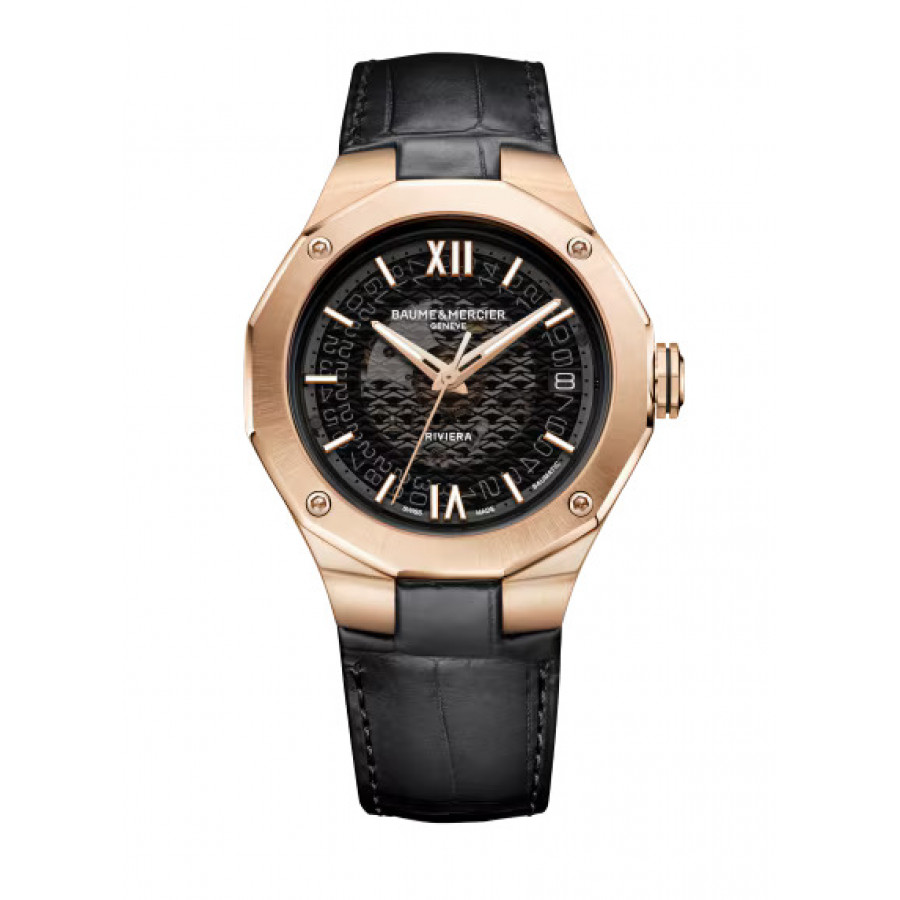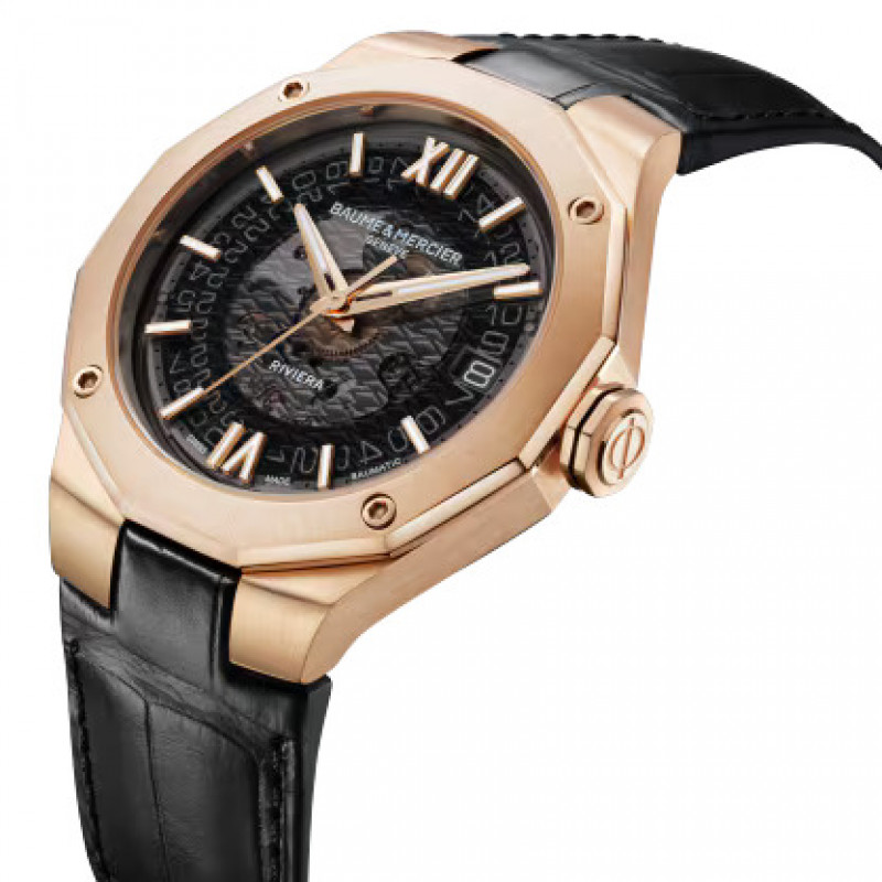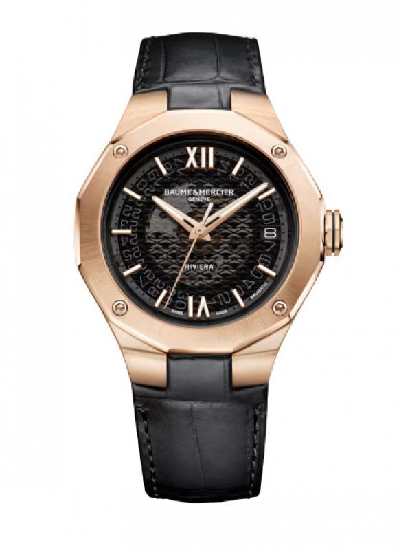 Il modello Riviera 10787 presenta una cassa dodecagonale in oro rosa (750/1000) lucido-satinato abbinata a un quadrante in vetro zaffiro nero trasparente. Le proporzioni di questo elegante segnatempo mostrano l’equilibrio perfetto di cui Baume & Mercier è in perenne ricerca: 39 mm di diametro per 9,6 mm di spessore. La raffinatezza della lunetta in oro rosa (750/1000) lucido e satinato soleil – fissata con quattro viti in oro rosa (750/1000) – si estende alla corona ottagonale libera, anch’essa realizzata in oro rosa (750/1000) e ornata con l’emblema del brand, il logo Phi in rilievo con una linea nera.