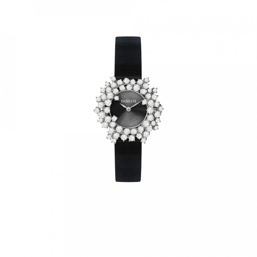 Orologio Damiani in oro bianco e di diamanti, cinturino nero collezione Mimosa.