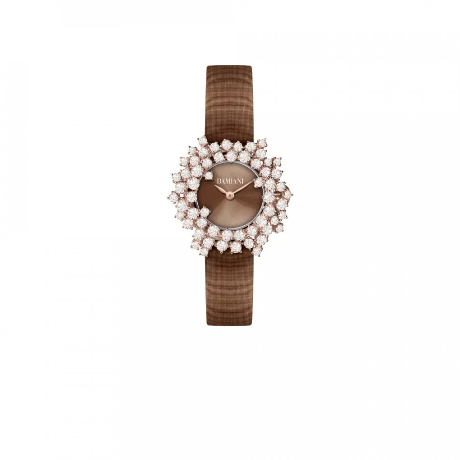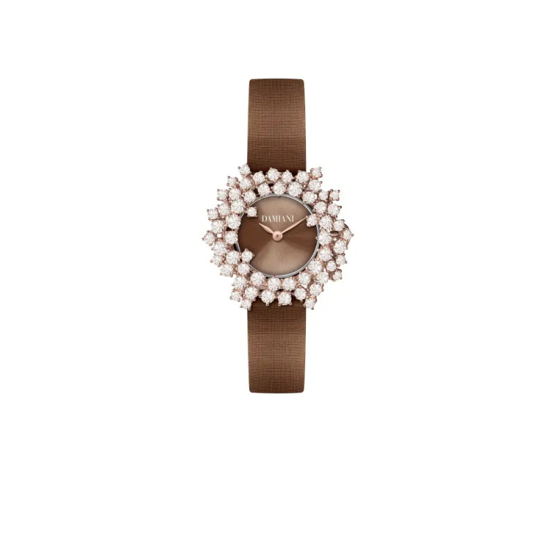 Orologio Damiani in oro bianco e di diamanti, cinturino e quadrante marrone collezione Mimosa.