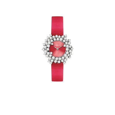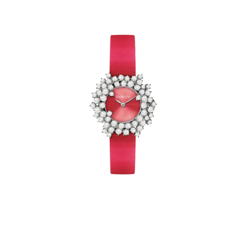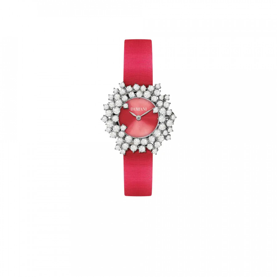 Orologio Damiani in oro bianco e di diamanti, cinturino e quadrante rosso collezione Mimosa.