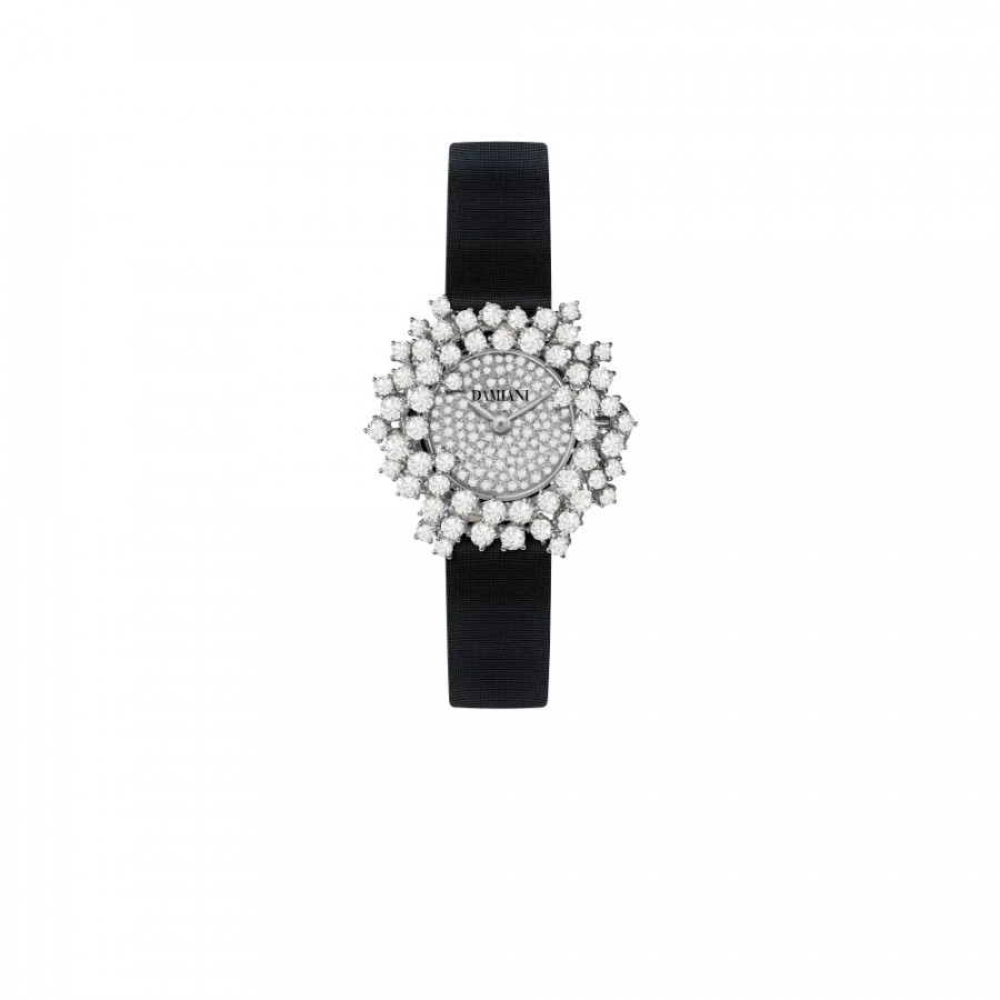 Orologio Damiani in oro bianco e pavè di diamanti, cinturino nero collezione Mimosa.