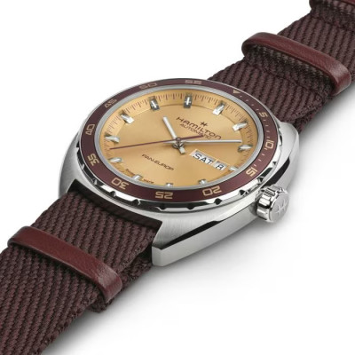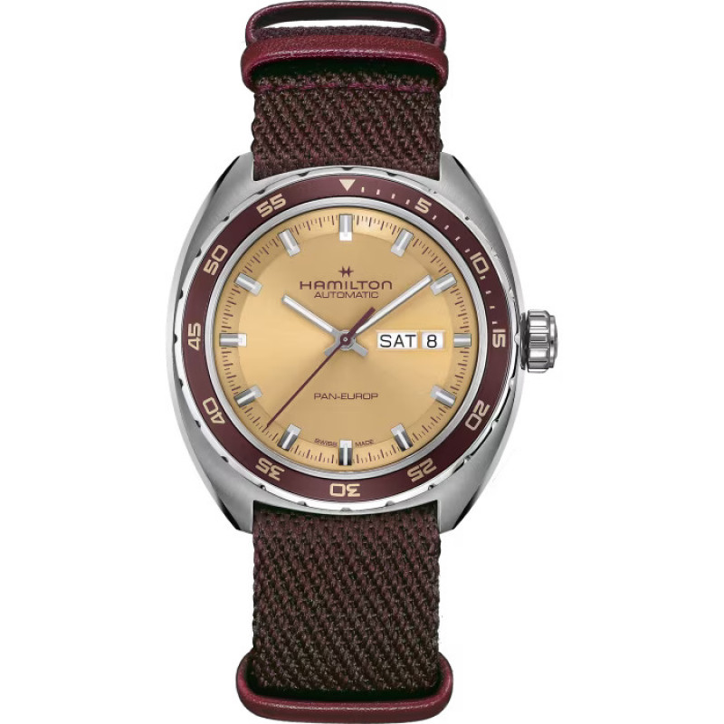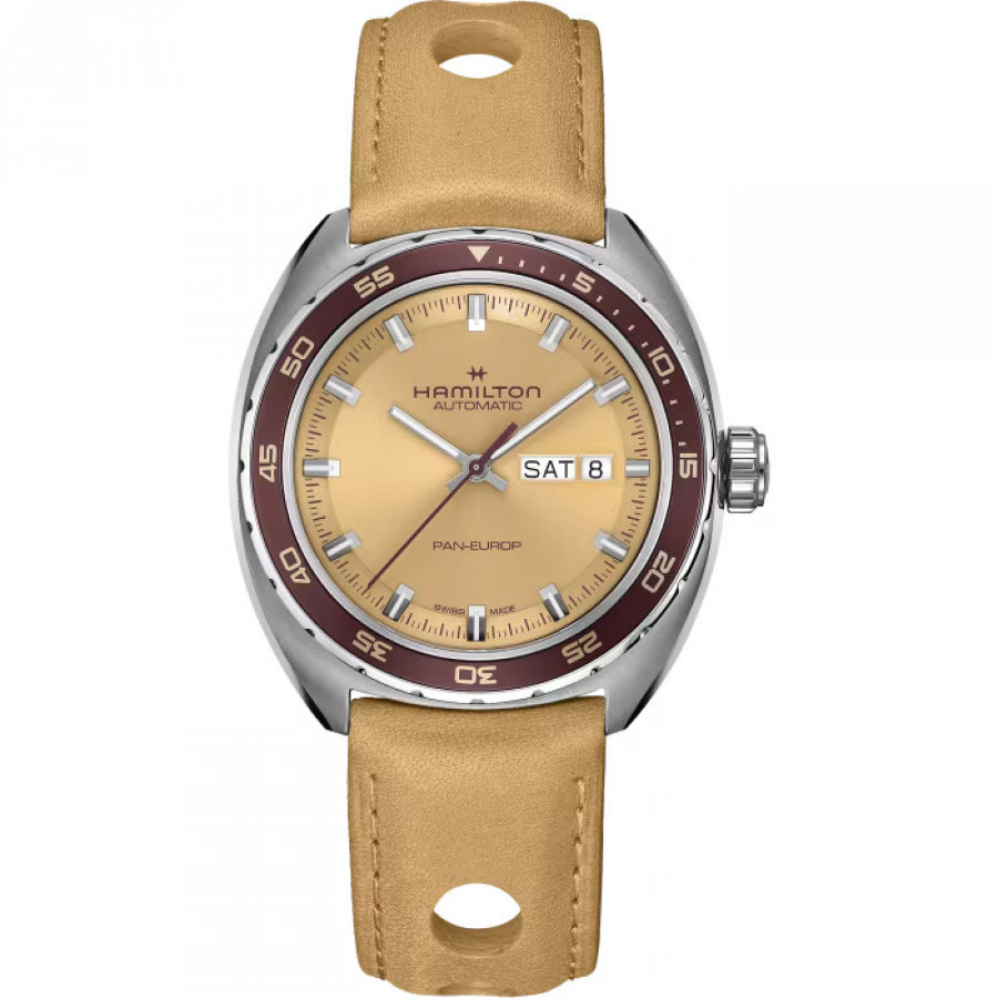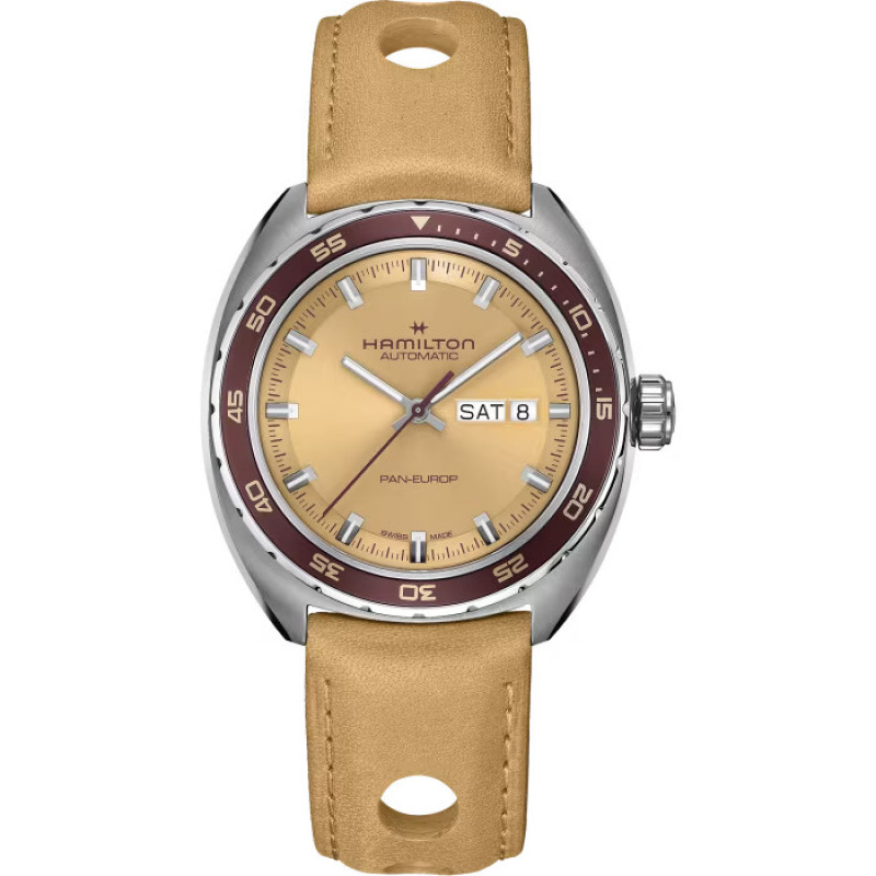 Fai un tuffo nel passato con questo Pan Europ Automatic da 42 mm dal design d’ispirazione vintage anni ‘60. In uno stile retrò che ben si adatta alla vita odierna, questo orologio presenta una cassa in acciaio a forma di cuscino con una lunetta girevole unidirezionale. Dotato del movimento automatico H-30 con una riserva di carica di 80 ore, l'Hamilton Pan Europ Automatic è il perfetto alleato per vincere la corsa contro il tempo. A completare il look, due cinturini intercambiabili: uno in tessuto intrecciato NATO bordeaux e uno in morbida pelle traforata beige sabbia, che richiama l’atmosfera delle corse automobilistiche degli anni ‘60.