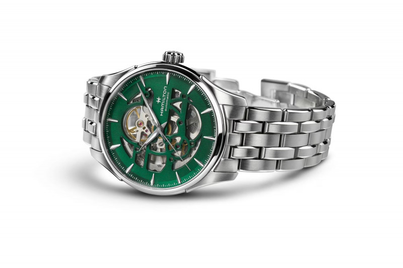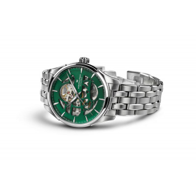 Connubio perfetto di tradizione e innovazione, l'Hamilton Jazzmaster Skeleton 40 mm permette di ammirare il movimento automatico svizzero in azione. Il quadrante scheletrato, con la sua straordinaria tonalità verde impero, rivela il movimento automatico H-10-S, con 25 rubini e un’impressionante riserva di carica di 80 ore. Questo iconico segnatempo è abbinato a un elegante bracciale in acciaio, che incarna dinamismo moderno e fascino intramontabile.