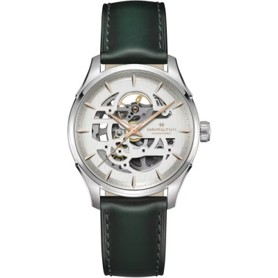 Il Jazzmaster Skeleton 40 mm, con il suo quadrante traforato argento, punta tutto sulla precisione e rivela al contempo la raffinata bellezza del movimento meccanico al suo interno. Mettendo in risalto il movimento automatico H-10, con una riserva di carica di 80 ore e spirale in Nivachron™, l'Hamilton Jazzmaster Skeleton vanta un sofisticato cinturino in pelle verde, che incarna il savoir-faire in continua evoluzione di Hamilton e l'attenzione ai dettagli.
