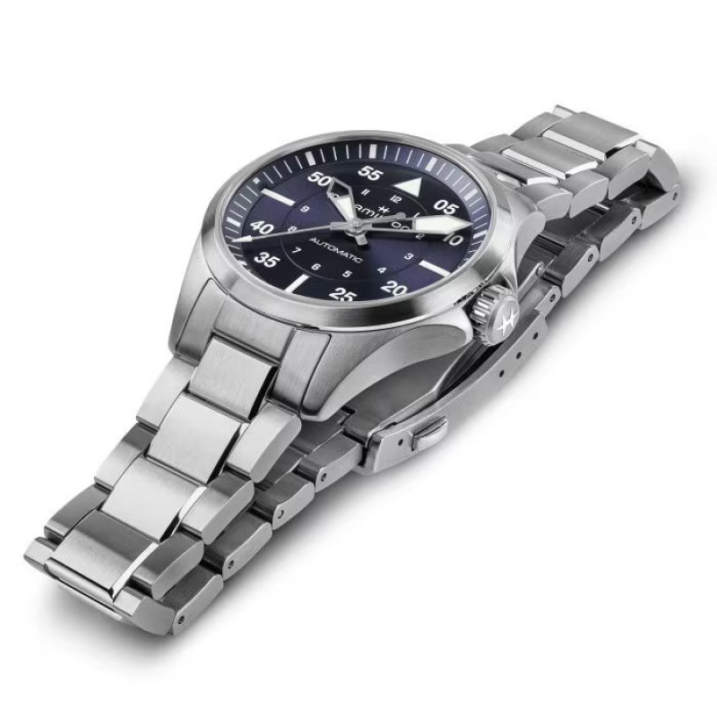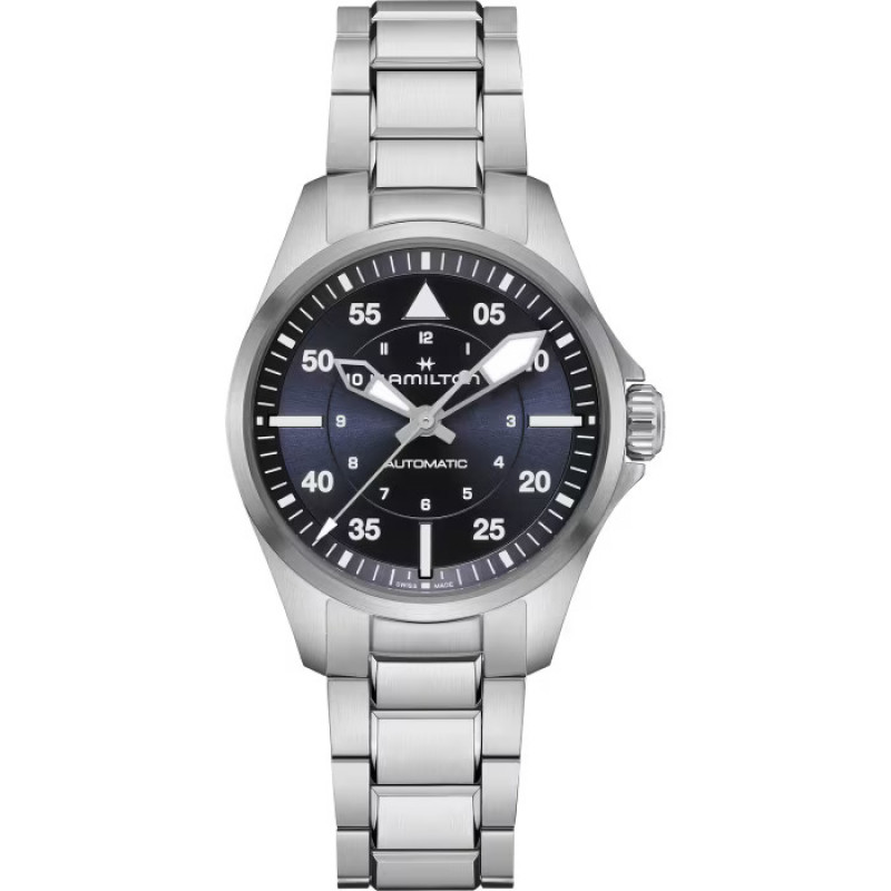 Realizzato pensando agli appassionati di aviazione, il Khaki Pilot Auto richiama immediatamente lo spirito di esplorazione e di avventura del Khaki. Alimentate dal movimento automatico H-10 con riserva di carica di 80 ore e spirale in Nivachron™, le versioni da 36 mm rispettano il trend di orologi più piccoli. Sebbene sempre rispettosi degli standard di precisione per la cabina di pilotaggio, questi design più compatti si prestano alla vita nei cieli ma anche sulla terraferma. Il Khaki Pilot Auto abbina un intramontabile bracciale in acciaio inossidabile e un quadrante di un blu mezzanotte scuro affascinante, con rivestimento Super-LumiNova per una maggiore leggibilità.