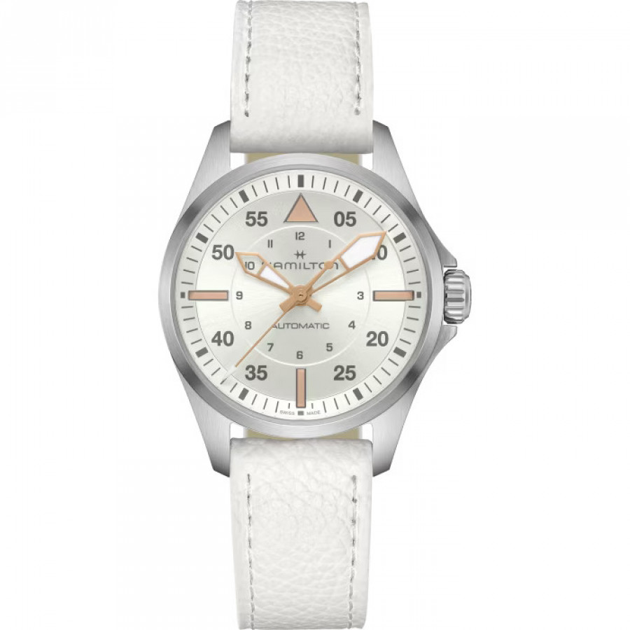 Realizzato pensando agli appassionati di aviazione, il Khaki Pilot Auto richiama immediatamente lo spirito di esplorazione e di avventura del Khaki. Alimentate dal movimento automatico H-10 con riserva di carica di 80 ore e spirale in Nivachron™, le versioni da 36 mm rispettano il trend di orologi più piccoli. Sebbene sempre rispettosi degli standard di precisione per la cabina di pilotaggio, questi design più compatti si prestano alla vita nei cieli ma anche sulla terraferma. Il Khaki Pilot Auto abbina un cinturino in pelle bianco e un quadrante bianco-argento, con rivestimento Super-LumiNova per una maggiore leggibilità.