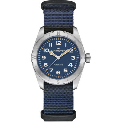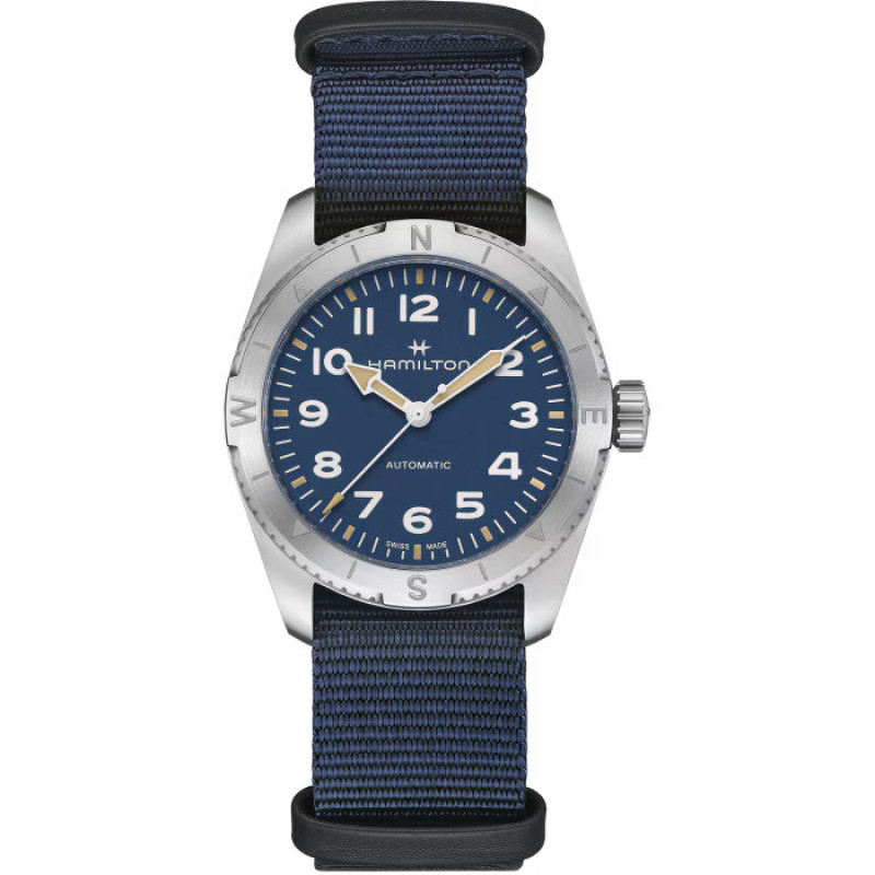 Prepararsi per le avventure all’aria aperta non è mai stato così facile grazie all'Hamilton Khaki Field Expedition e al suo nuovo cinturino NATO. Un orologio ideale per tutte le attività outdoor con un design a bussola, che ti permetterà, durante le escursioni, di orientarti con l'aiuto del sole. Racchiuso in una cassa in acciaio da 37 mm corredata da un cinturino NATO in tessuto blu, il segnatempo è dotato di corona a vite e di un quadrante blu con finitura sabbiata, che lo rendono estremamente resistente.
