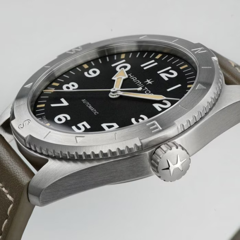 Preparati per un’avventura all’aria aperta con il Khaki Field Expedition, un orologio ideale per tutte le attività outdoor con un design a bussola, che ti permetterà, durante le escursioni, di orientarti con l'aiuto del sole. Racchiuso in una cassa in acciaio da 41 mm corredata da un cinturino in pelle verde, questo orologio è dotato di corona a vite per proteggere il movimento in qualunque condizione atmosferica. Dotato di un quadrante nero testurizzato con rivestimento in Super-LumiNova® per una leggibilità eccezionale, il Khaki Field Expedition possiede tutta la robustezza di cui hai bisogno.